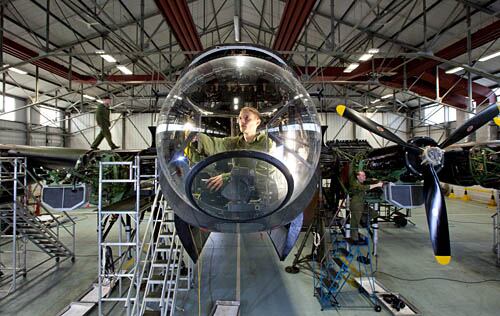 Aircraft technician Edward Cash works in the nose bay of a Lancaster Bomber at the 'Battle of Britain Memorial Flight' centre at RAF Coningsby on Feb. 9 in Coningsby, England. The Lancaster PA474 was built in 1945, and is one of only two operational aircarft ramianing of the 7377 that were built. Planes at the base are currently undergoing their annual service in preperation for this years 70th anniversary Battle of Britain Celebrations at the Royal International Air Tattoo at RAF Fairford. ( Dan Kitwood/Getty Images)