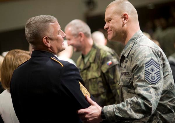 Chief Master Sergeant of the Air Force James A. Roy greets Command Sergeant Major Raymond Chandler at his swearing-in ceremony to become Sergeant Major of the Army at the Pentagon, Va. March 1st, 2011. (Chris Maddaloni/Staff)