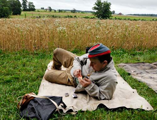 Kevin Tabor,of Pittsburg, Pa., lights his pipe while relaxing near Pitzer Woods on the battlefield at Gettysburg, Pa., on Wednesday, July 3, 2013. (Mike Morones/Staff)